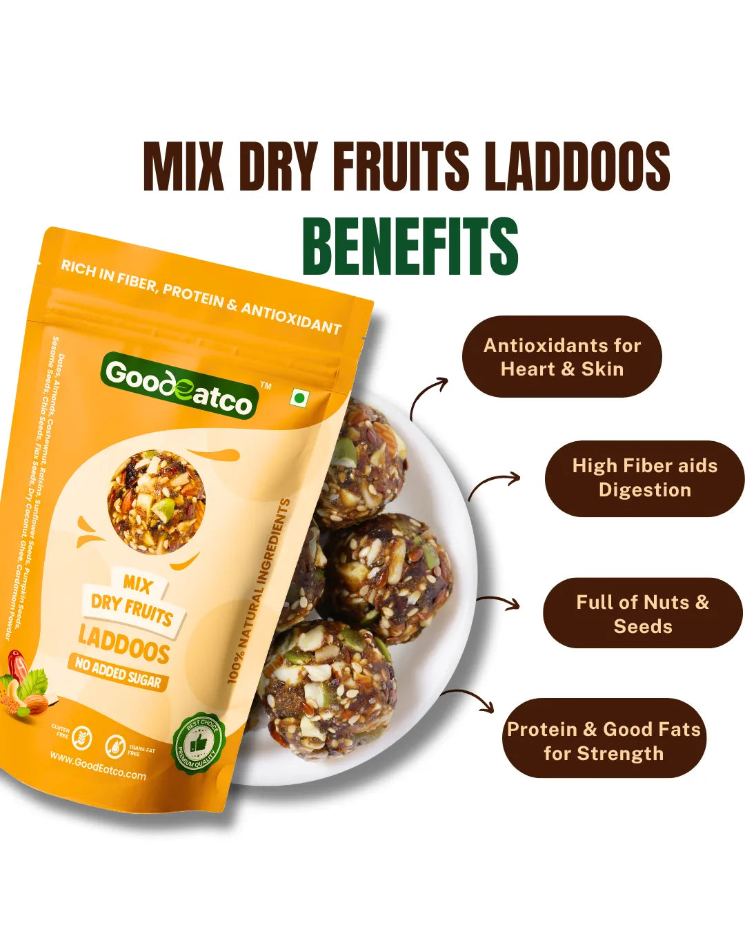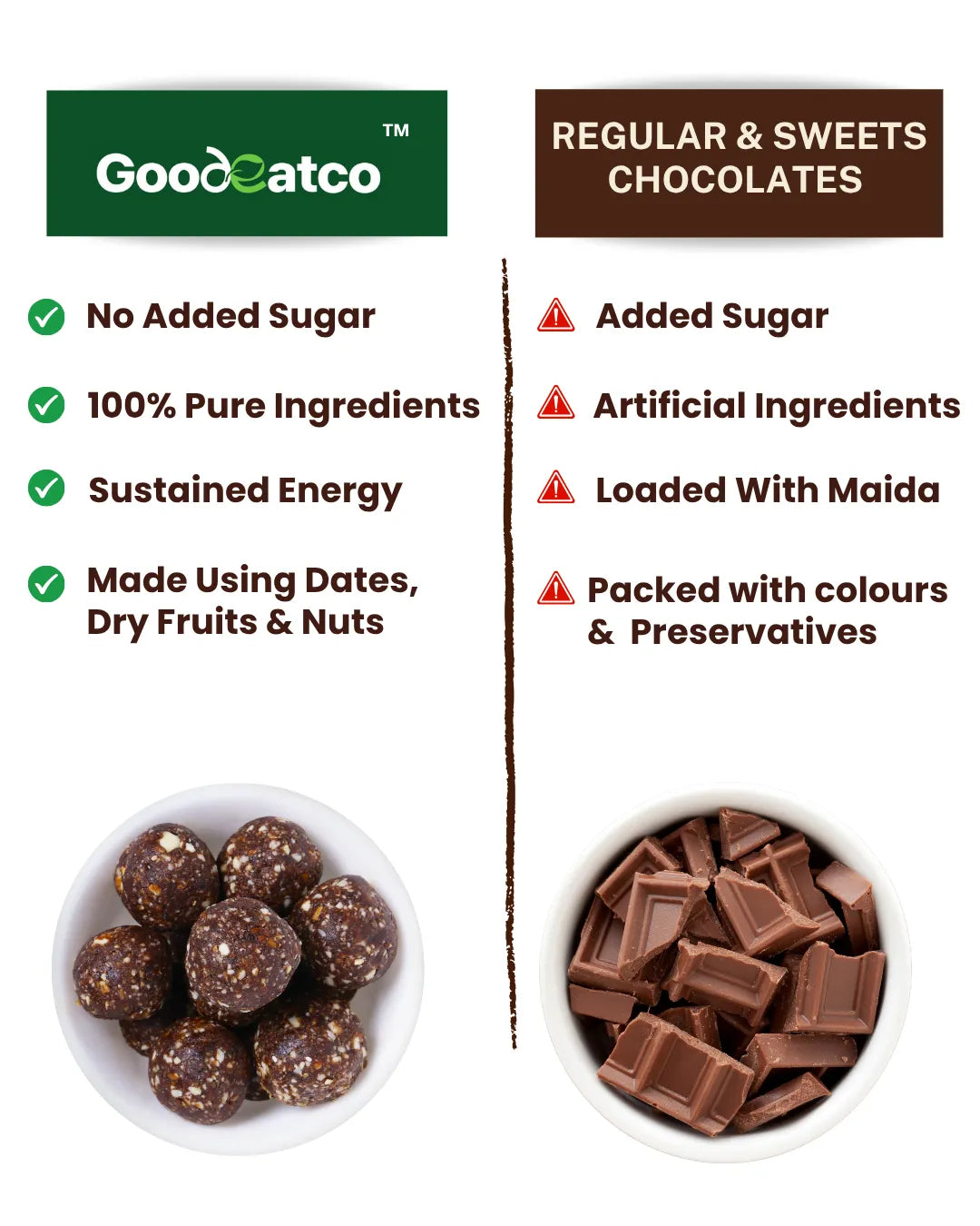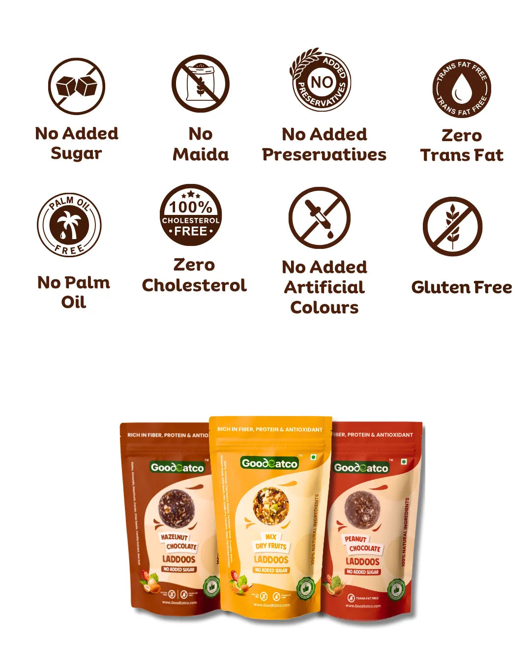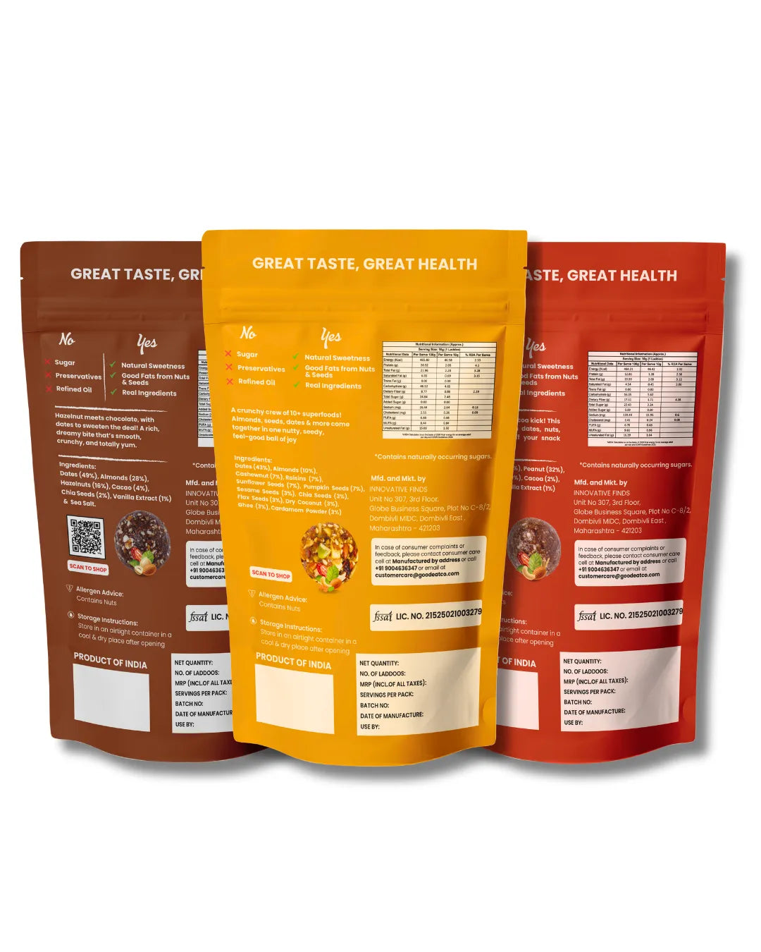 Wholesome Variety. Guilt-Free Indulgence. One Delicious Deal. Experience the perfect blend of health, taste, and indulgence with the GoodEatco Premium Laddoo Collection — a thoughtfully curated Pack of 3, featuring 54 bite-sized laddoos in three unique natural flavours. Each laddoo is handcrafted from premium nuts, seeds, and dates, offering the richness of traditional Indian mithai with the purity of clean, modern ingredients. Whether you’re looking for a healthy snack, post-meal treat, or thoughtful gift, this trio is your go-to choice for everyday nourishment with a touch of indulgence.