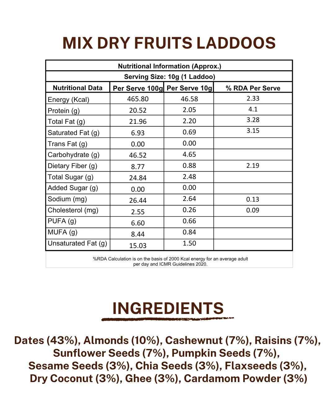 Dates, Almonds, Cashewnuts, Raisins, Sunflower Seeds, Pumpkin Seeds, Sesame Seeds, Chia Seeds, Flaxseeds, Dry Coconut, Ghee, Cardamom Powder