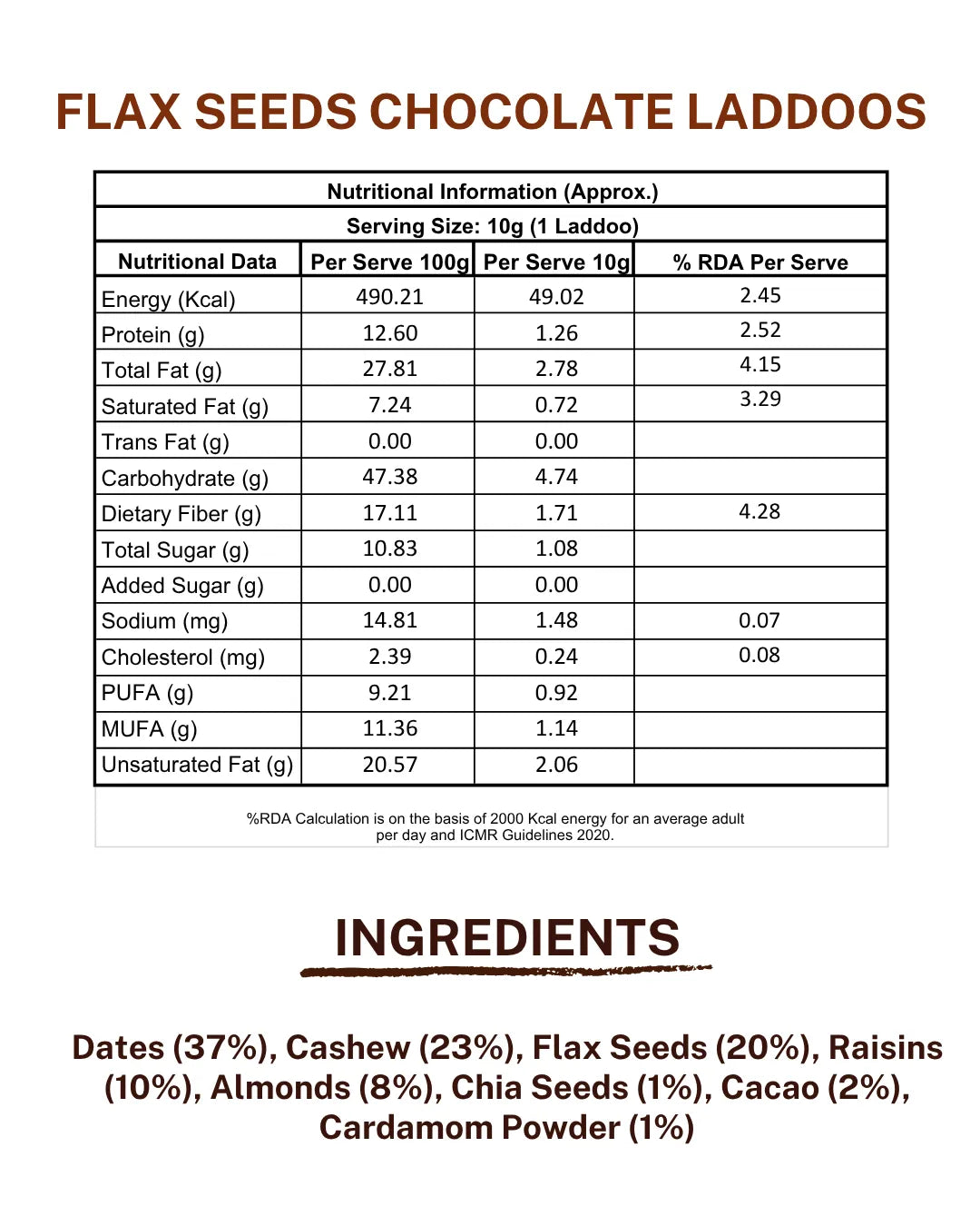 Power up with Flax Seeds Chocolate Laddoos, crafted with protein-rich flax seeds, almonds, cashews, premium dry fruits, and cacao. Naturally sweetened with dates and flavoured with a touch of cardamom,these laddoos deliver the perfect balance of taste, texture, and nourishment.