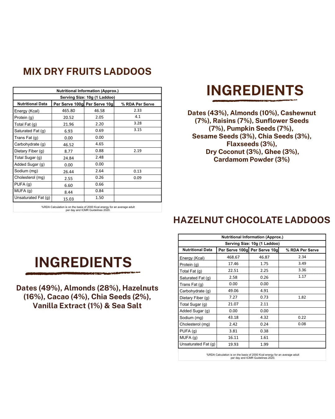 Dates, Almonds, Cashewnuts, Raisins, Sunflower Seeds, Pumpkin Seeds, Sesame Seeds, Chia Seeds, Flaxseeds, Dry Coconut, Ghee, Cardamom Powder