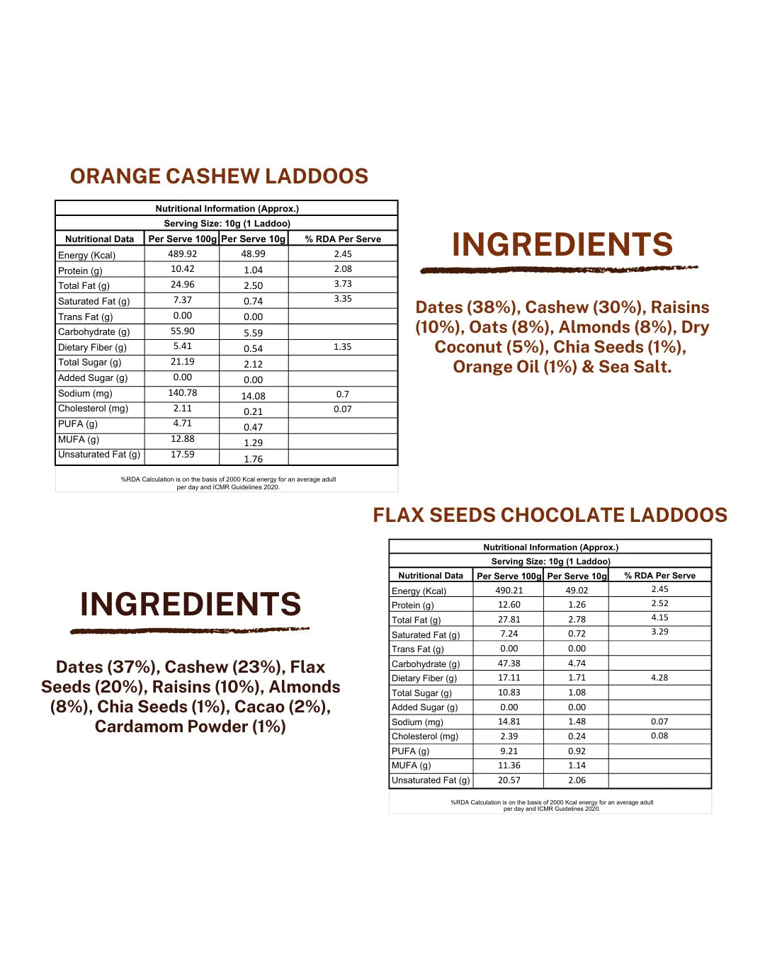 Dates, Cashew, Flax Seeds, Raisins, Almonds, Chia Seeds, Cacao, Cardamom Powder