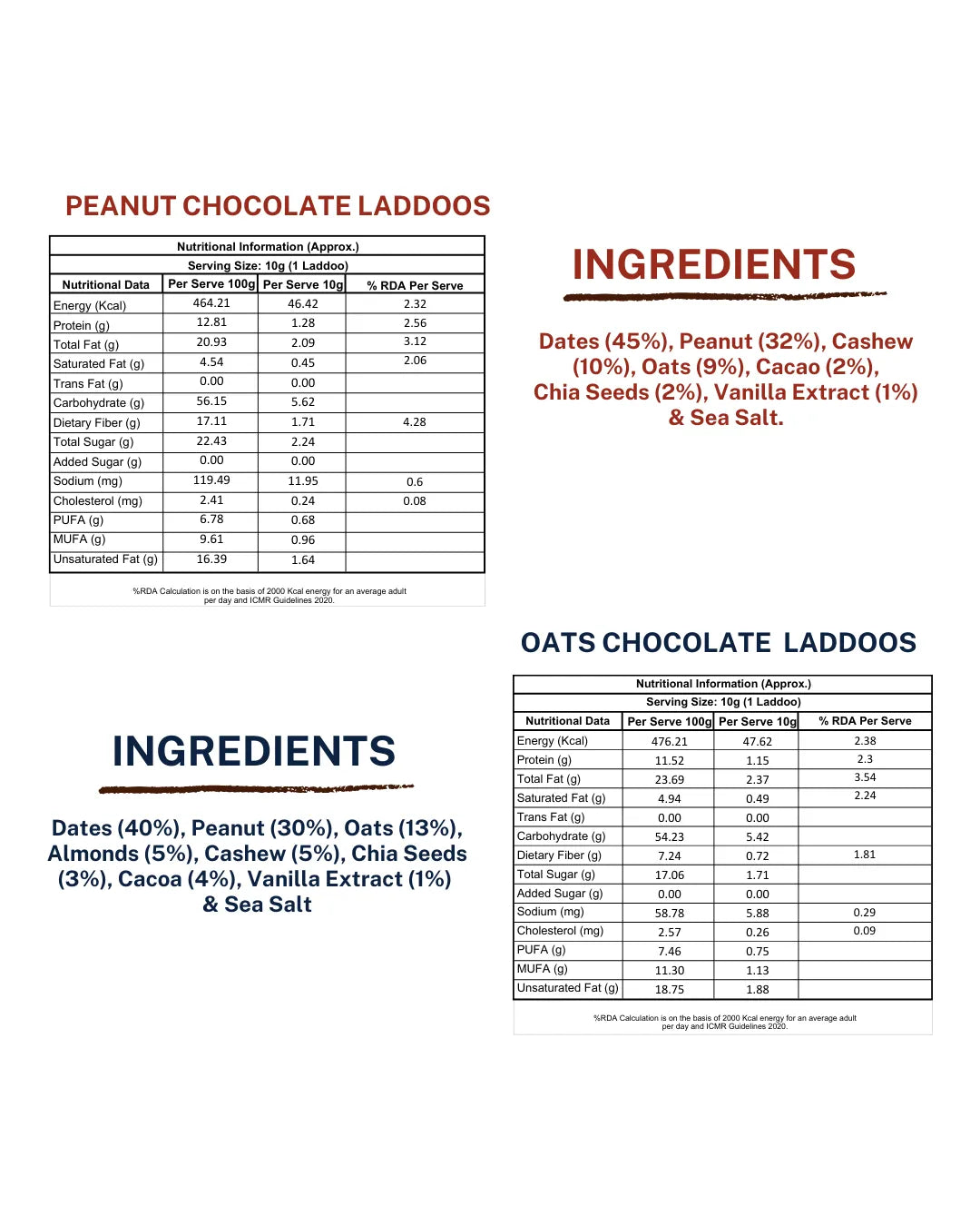 Dates, Peanut, Almonds, Cashew, Oats, Cacao, Chia Seeds, Vanilla Extract, Sea Salt