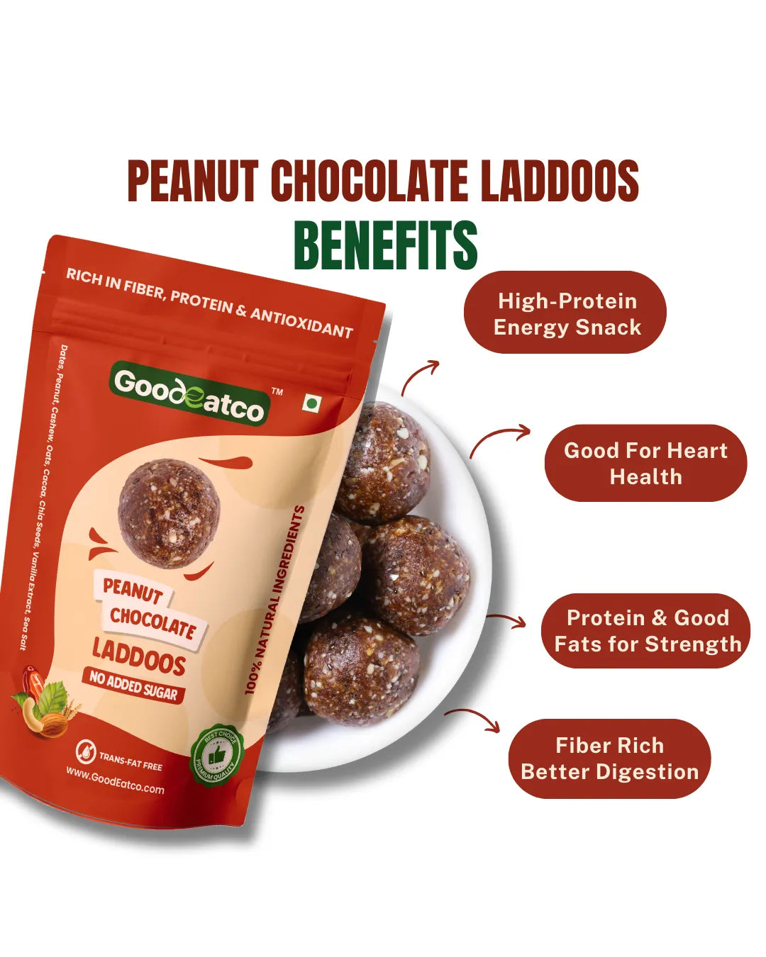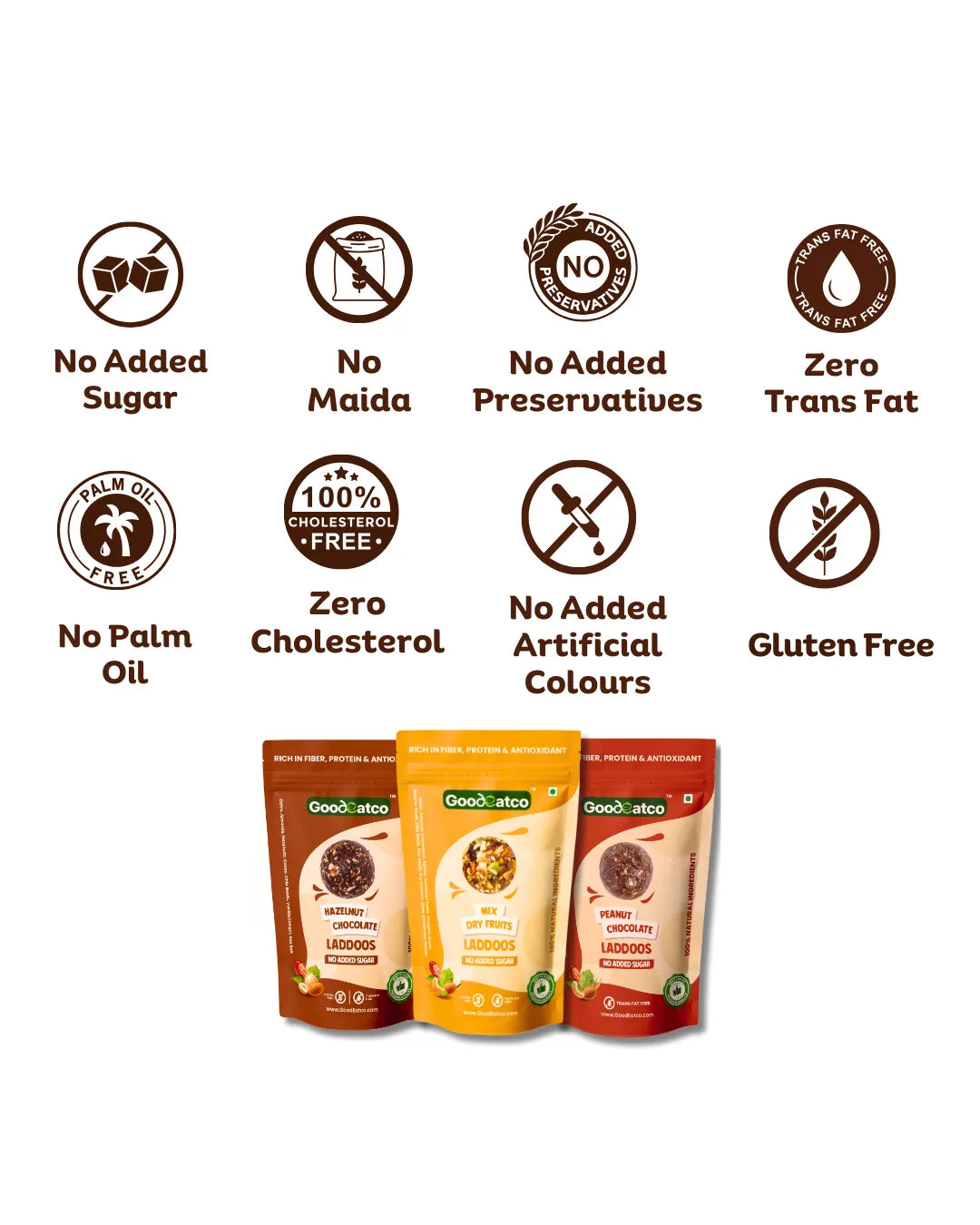 Wholesome Variety. Guilt-Free Indulgence. One Delicious Deal. Experience the perfect blend of health, taste, and indulgence with the GoodEatco Premium Laddoo Collection — a thoughtfully curated Pack of 3, featuring 54 bite-sized laddoos in three unique natural flavours. Each laddoo is handcrafted from premium nuts, seeds, and dates, offering the richness of traditional Indian laddoos with the purity of clean, modern ingredients. Whether you’re looking for a healthy snack, post-meal treat, or thoughtful gift, this trio is your go-to choice for everyday nourishment with a touch of indulgence.
