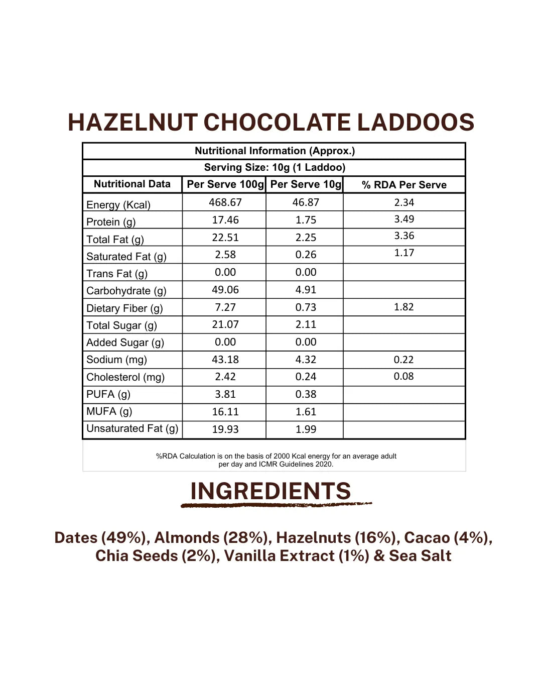 Dates, Almonds, Hazelnuts, Cacao, Chia Seeds, Vanilla Extract, Sea Salt