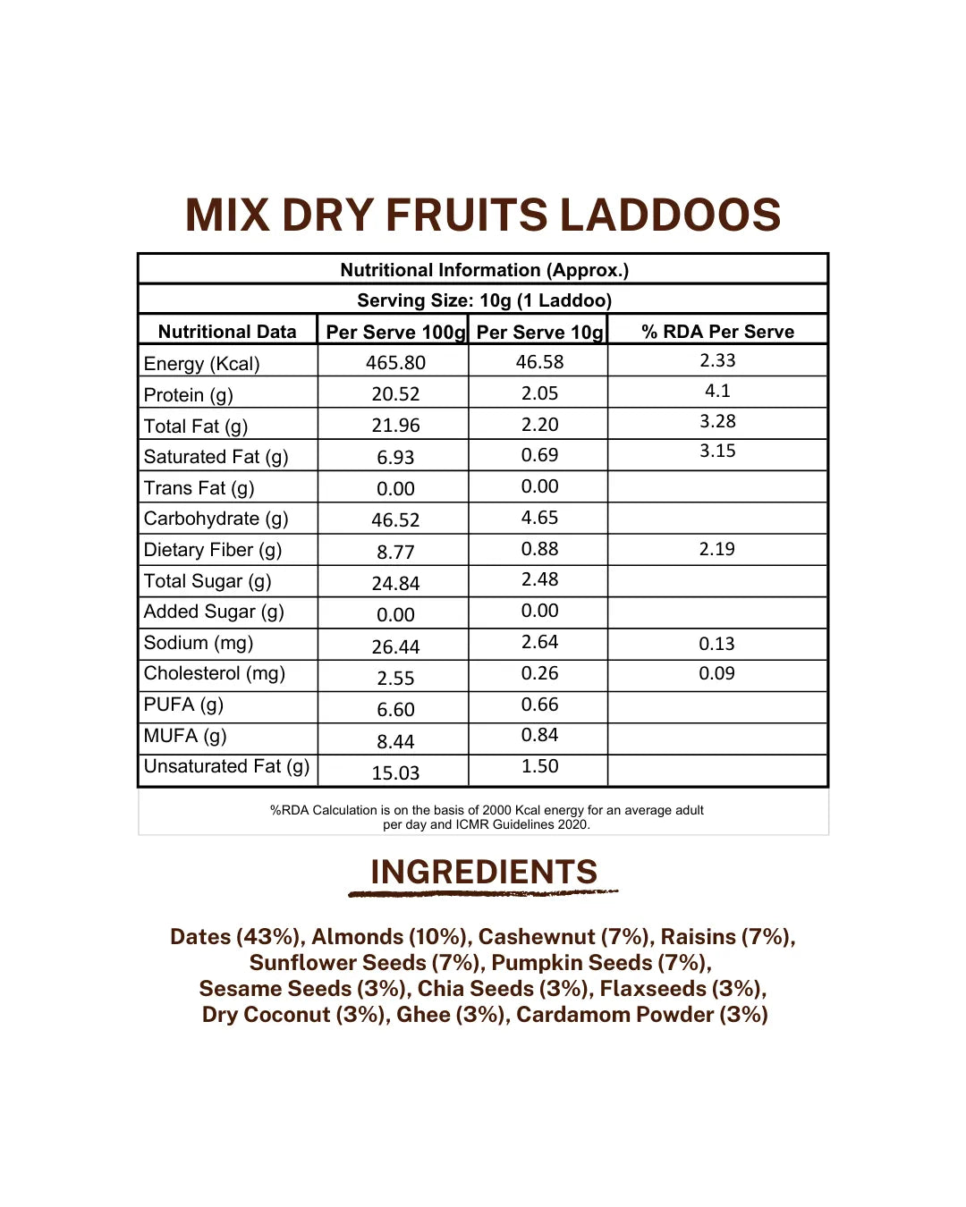 Dates, Almonds, Cashewnuts, Raisins, Sunflower Seeds, Pumpkin Seeds, Sesame Seeds, Chia Seeds, Flaxseeds, Dry Coconut, Ghee, Cardamom Powder