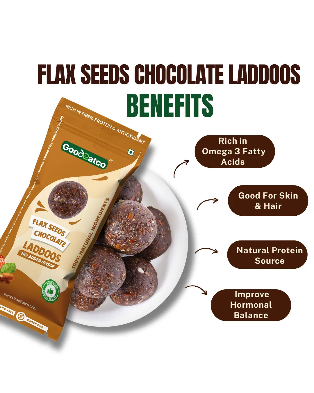 Power up with Flax Seeds Chocolate Laddoos, crafted with protein-rich flax seeds, almonds, cashews, premium dry fruits, and cacao. Naturally sweetened with dates and flavoured with a touch of cardamom,these laddoos deliver the perfect balance of taste, texture, and nourishment.