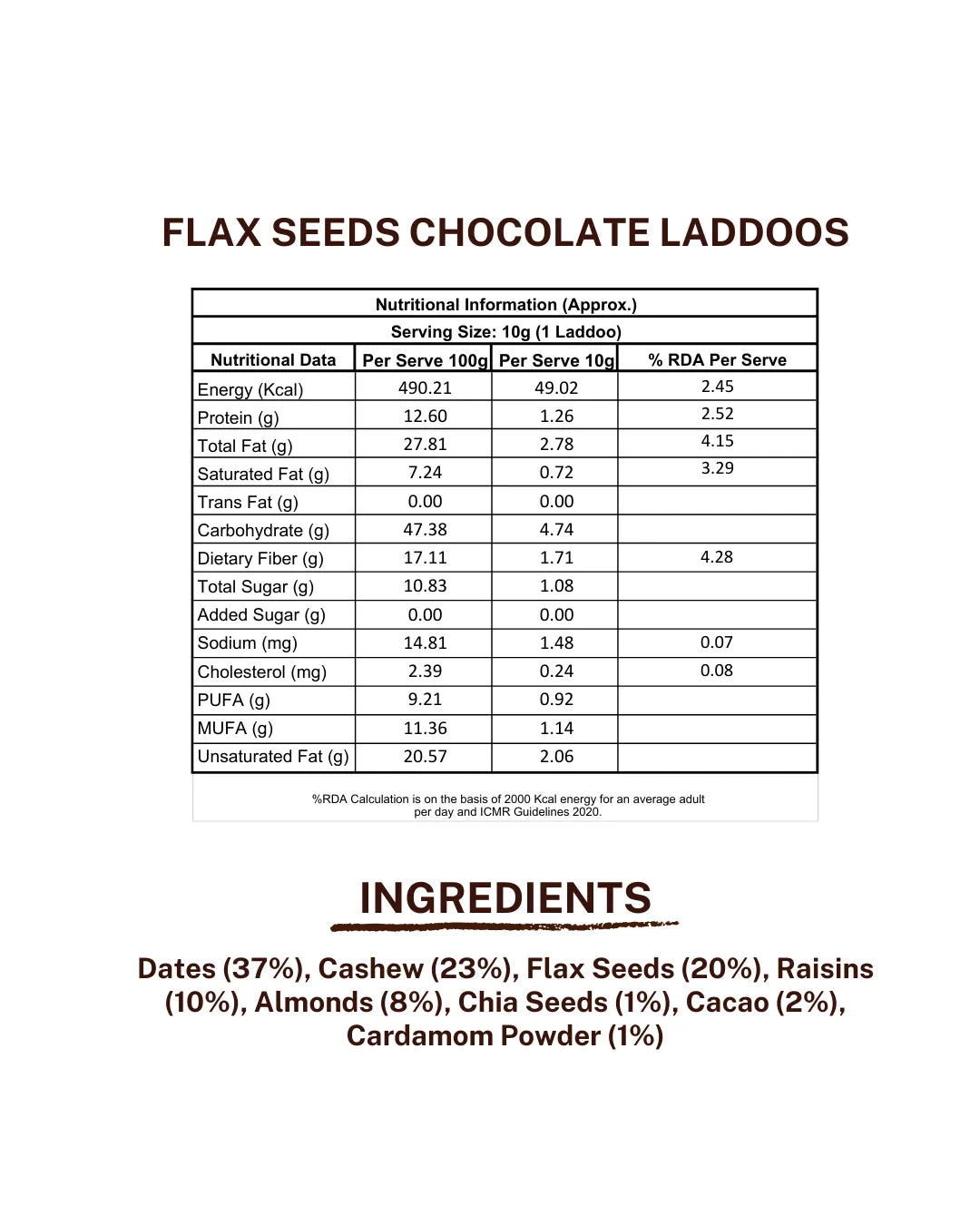 Dates, Cashew, Flax Seeds, Raisins, Almonds, Chia Seeds, Cacao, Cardamom Powder