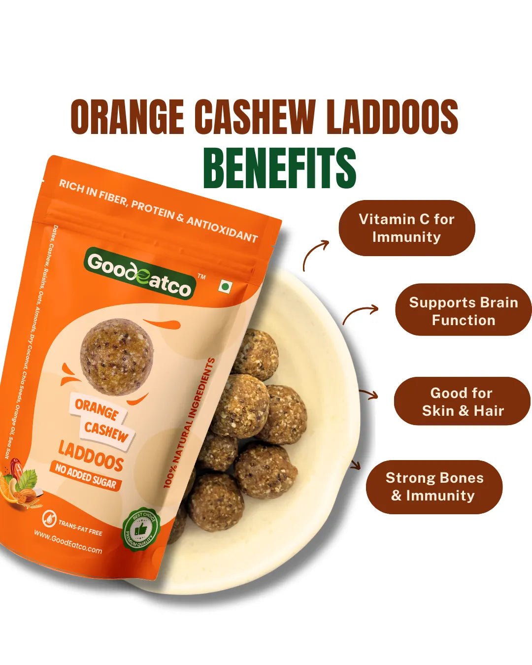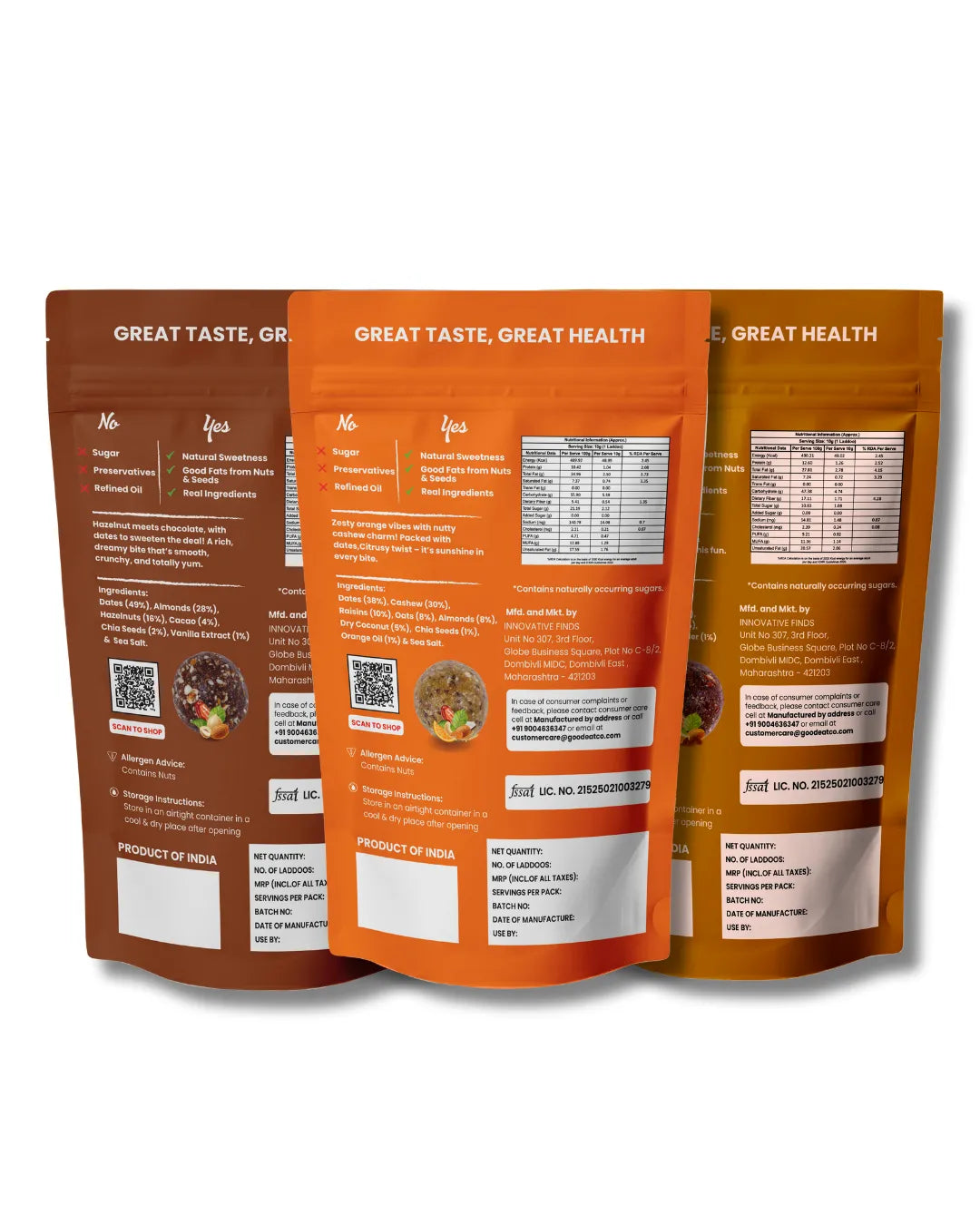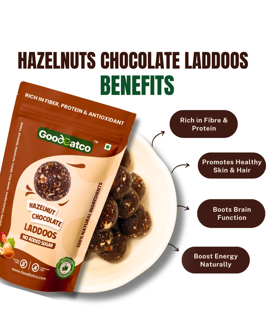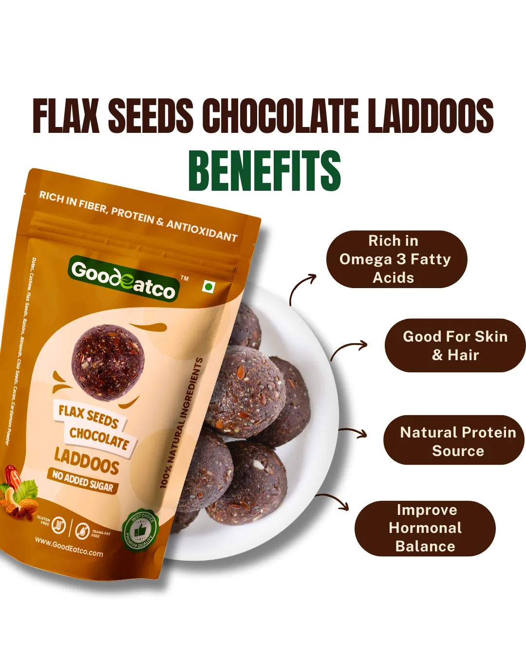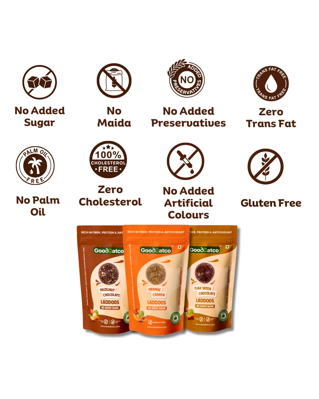 Wholesome Variety. Guilt-Free Indulgence. One Delicious Deal. Experience the perfect blend of health, taste, and indulgence with the GoodEatco Premium Laddoo Collection — a thoughtfully curated Pack of 3, featuring 54 bite-sized laddoos in three unique natural flavours. Each laddoo is handcrafted from premium nuts,seeds, and dates, offering the richness of traditional Indian laddoos with the purity of clean, modern ingredients. Whether you’re looking for a healthy snack, post-meal treat, or thoughtful gift, this trio is your go-to choice for everyday nourishment with a touch of indulgence.