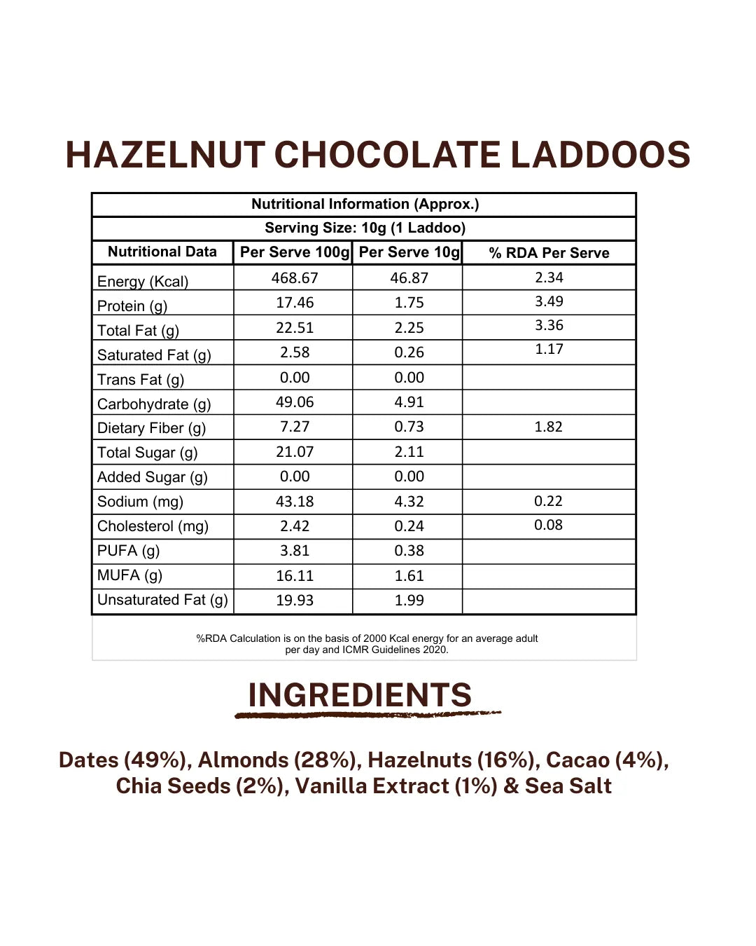 Dates, Almonds, Hazelnuts, Cacao, Chia Seeds, Vanilla Extract, Sea Salt