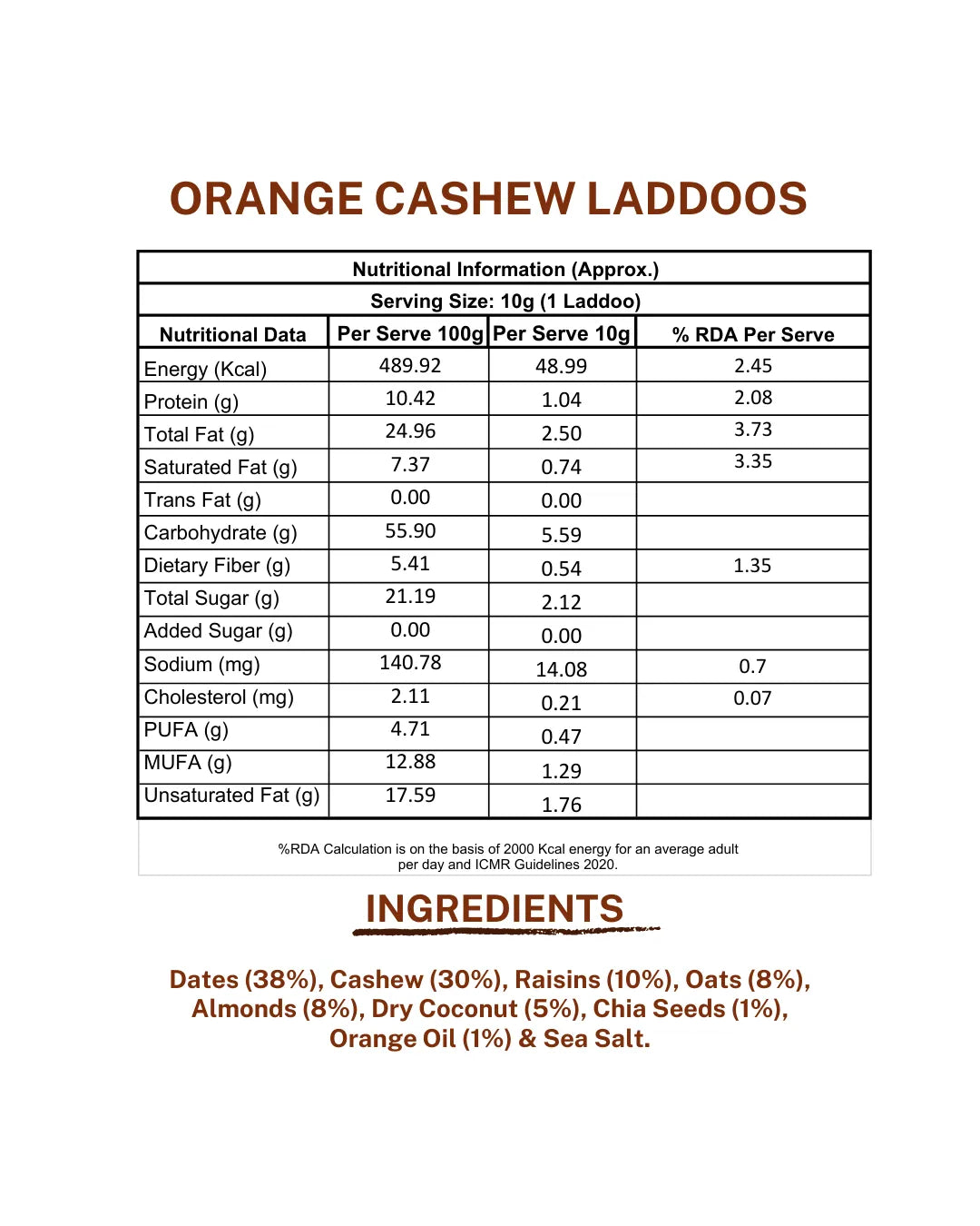 Dates, Cashew, Raisins, Oats, Almonds, Dry Coconut, Chia Seeds, Orange Oil, Sea Salt
