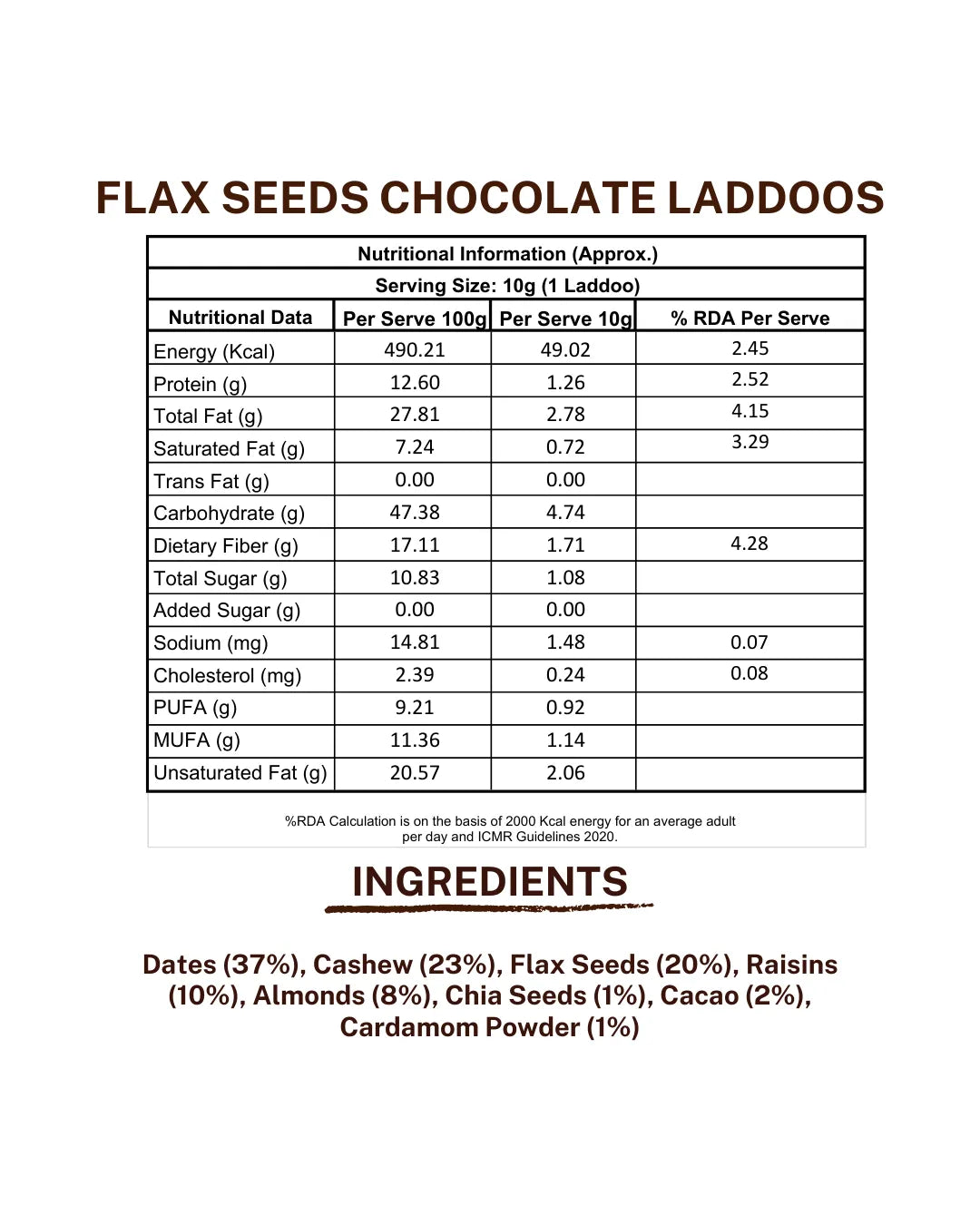 Dates, Cashew, Flax Seeds, Raisins, Almonds, Chia Seeds, Cacao, Cardamom Powder