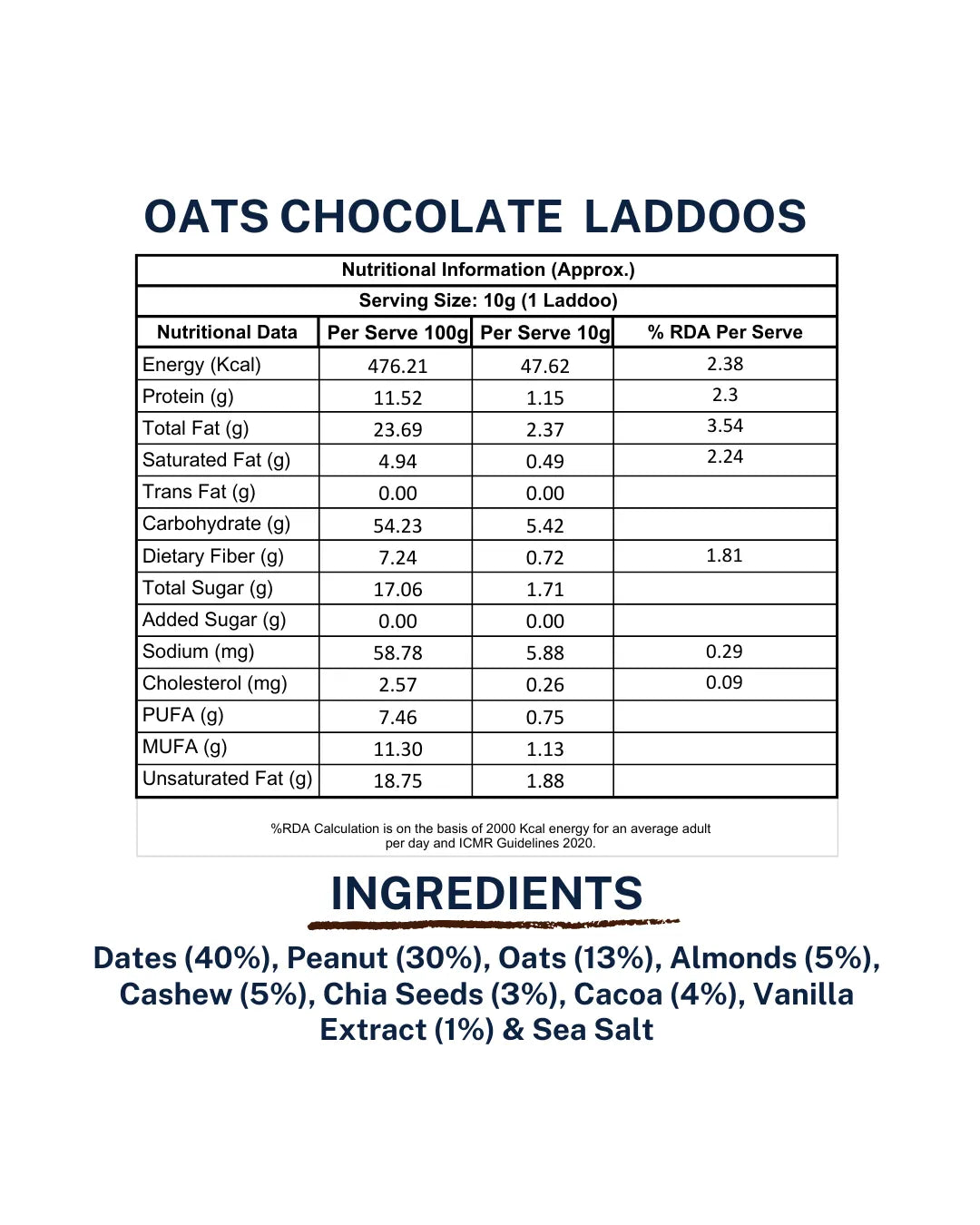 Dates, Peanut, Almonds, Cashew, Oats, Cacao, Chia Seeds, Vanilla Extract, Sea Salt