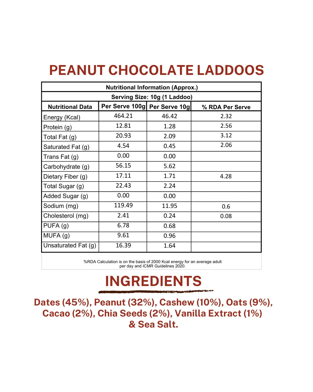 Dates, Peanut, Oats, Cashew, Chia Seeds, Cacao, Vanilla Extract, Sea Salt